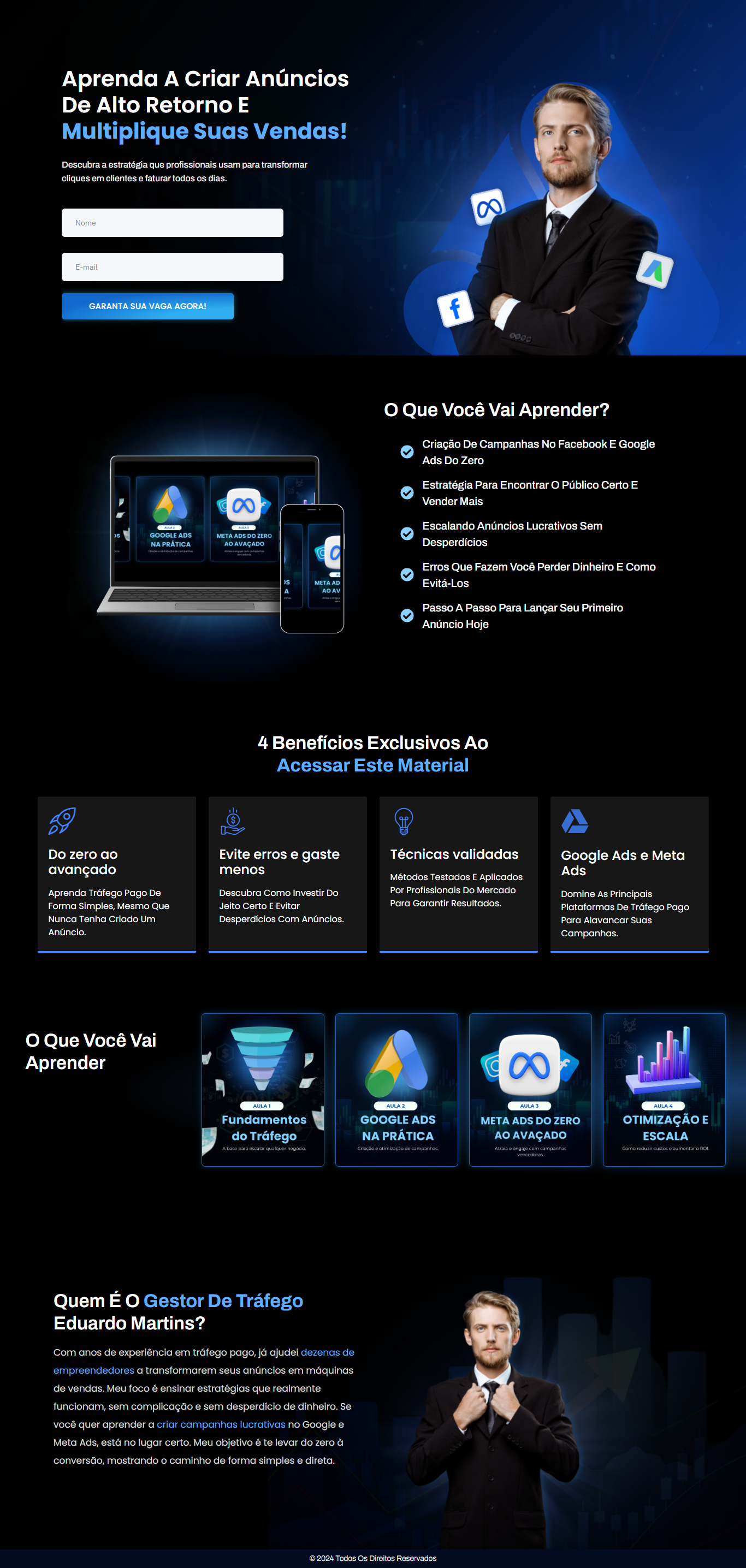 A porta de entrada do seu lançamento. Crio páginas otimizadas para capturar inscrições e gerar leads qualificados para suas aulas gratuitas ou eventos de lançamento.